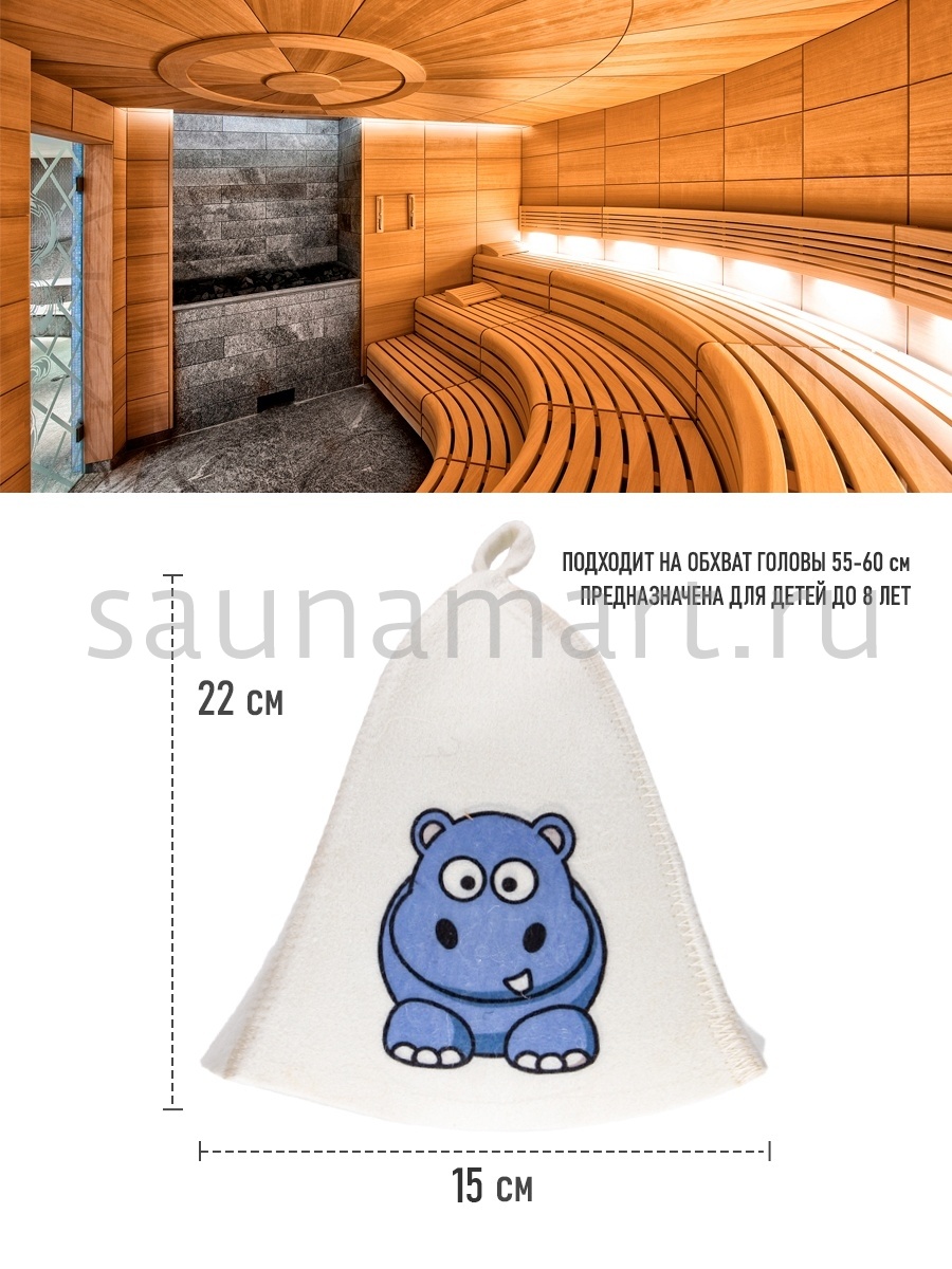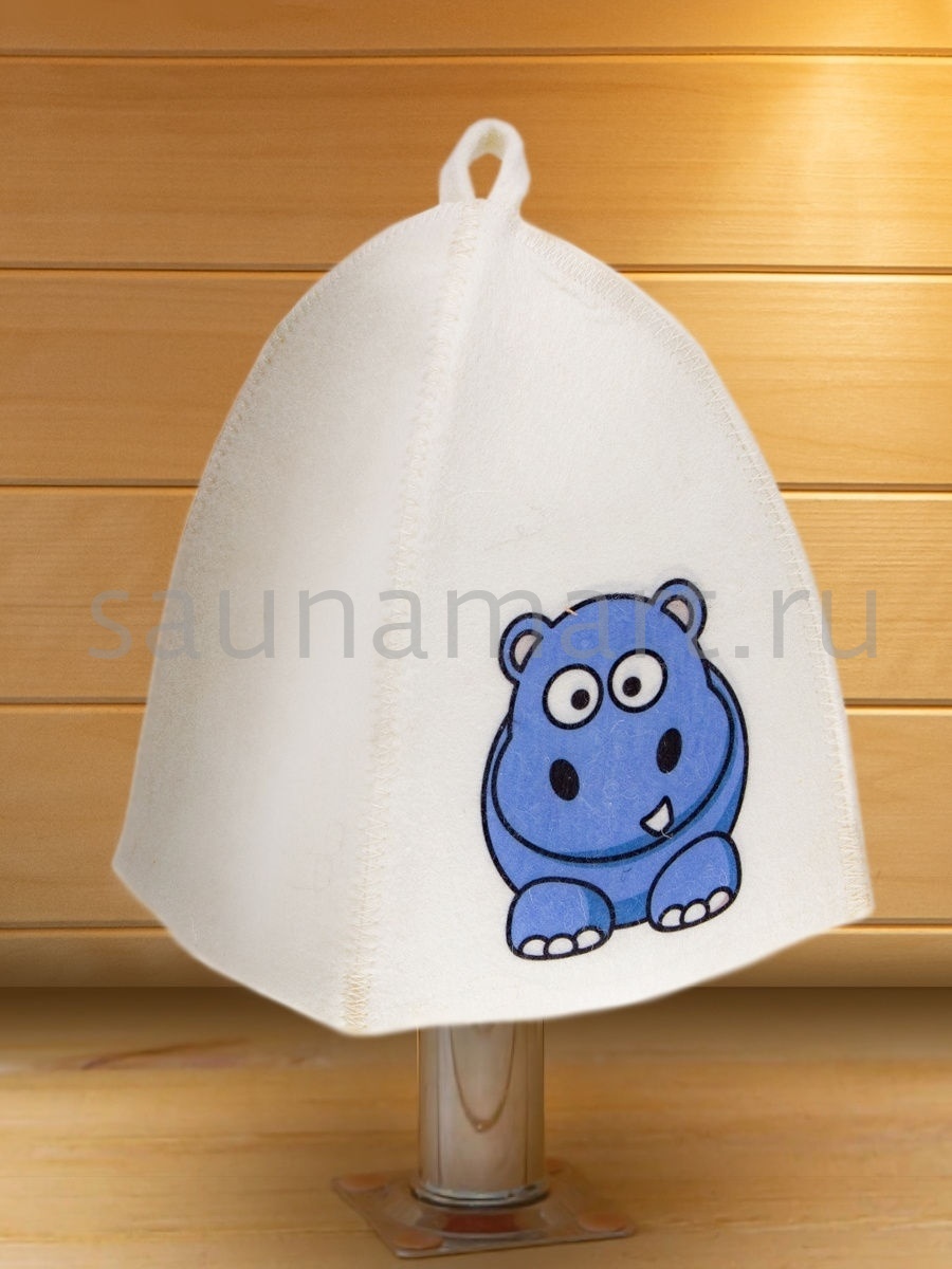 Шапка это необходимый атрибут для похода в баню или сауну – как для взрослых, так и для детей. Высокая температура и сухой воздух в парной могут вызвать перегрев и ожоги кожи головы. Шапка для бани убережет голову, уши и волосы от высокой температуры и перегрева. Если пренебрегать защитой головы с помощью шапочки, то волосы теряют влагу и становятся ломкими и сухими. Помимо термоизоляционных свойств банная шапка обладает отличными гигроскопичными свойствами - прекрасно впитывает влагу и пот, что сделает Ваше пребывание в парной более комфортным. Головной убор для бани выполнен из натурального материала – войлок. Материал достаточно пористый, за счет чего создает своеобразный защитный барьер  по принципу термоса, для изоляции от высокой температуры. Яркий рисунок бегемотика обязательно придется по вкусу ребенку. После применения расправьте шапку и просушите. Мы предлагаем Вам не только эффективное  средство защиты от перегрева, но и стильный яркий аксессуар для бани и сауны.