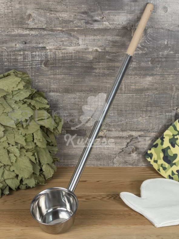 Длина банного инвентаря 80 см, диаметр ковшика 16 см.