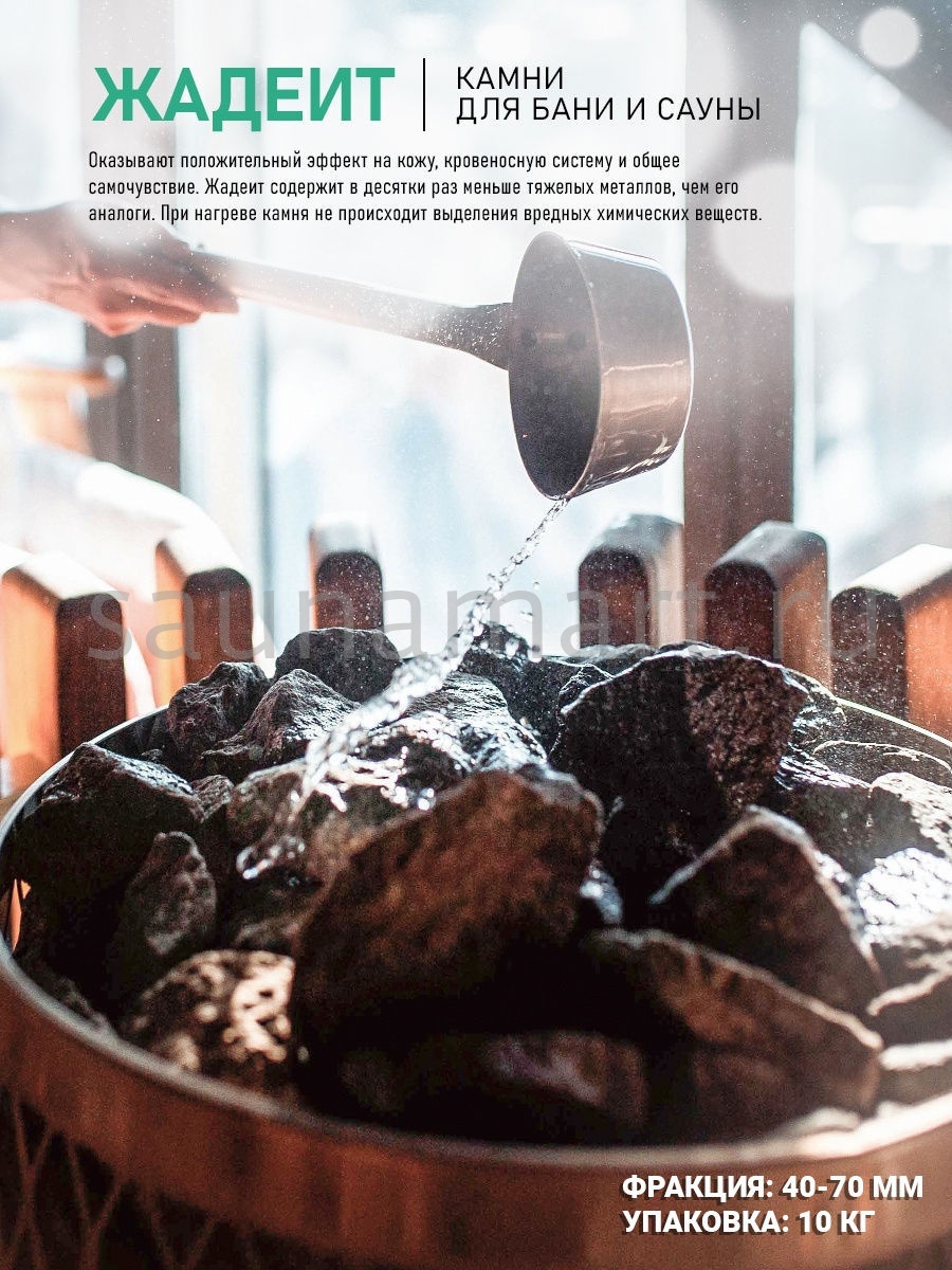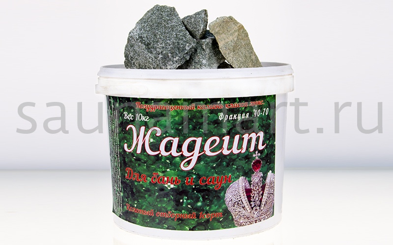 Применение жадеитовых камней в Вашей печи принесёт несомненную пользу здоровью и удовлетворит Ваши эстетические чувства. При контакте с водой, жадеит выделяет небольшое количество метакремниевой кислоты, тем самым, наделяя получающийся пар целебными свойствами. Посещение парной, где используются эти полудрагоценные камни, окажет положительный эффект на Вашу кожу, кровеносную систему и общее самочувствие. В случае, если Вы применяете лекарственные препараты, в особенности, созданные на травяной основе, их действие усилится после посещения парной с камнями из жадеита. Благодаря своей плотной структуре, жадеитовые камни отличаются длительным сроком службы. Колотые камни прекрасно подходят для заполнения резервуара печи в сауне. Шероховатая поверхность камней гарантирует более активное парообразование. Жадеит содержит в десятки раз меньше тяжелых металлов, чем его аналоги. Если Вы окатите жадеит горячей водой, то вы заметите уникальную особенность: зеленый цвет камня резко собирается в центр, а затем постепенно камень возвращается к своему первоначальному виду. Жадеит позволяет не боясь, лить на него воду часто и много раз. При этом растрескивания камня опасаться не стоит. При нагреве камня не происходит выделения вредных химических веществ.