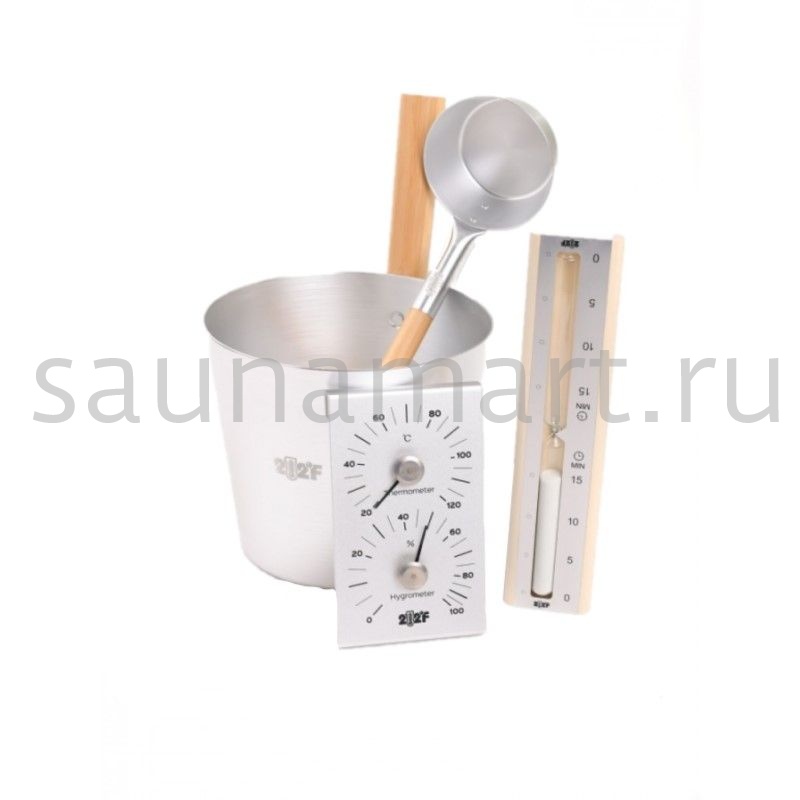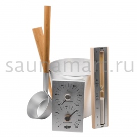 Комплектация - Ушат 5 л (ручка бамбук) -Черпак 33 см (ручка бамбук) -Термогигрометр - Песочные часы (белый песок)