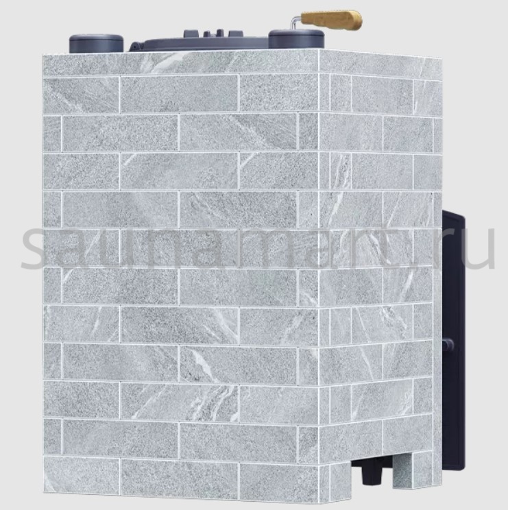 Форма куба и отсутствие отдельных опор на нижнем ярусе обеспечивает устойчивость на подиуме, а прочные крепления из алюминиевого сплава исключают расхождение плит. Перекрытие облицовки выполнено из 2-х плит так, чтобы отверстие под выход дымохода находилось между плитами и давало возможность проводить монтаж с уже установленным дымоходом без дополнительного демонтажа. Расположенные по краям облицовки заливные горловины для поддачи воды декорированы каменными хомутами, которые могут быть выполнены в цилиндрической или восьмигранной форме по Вашему выбору.