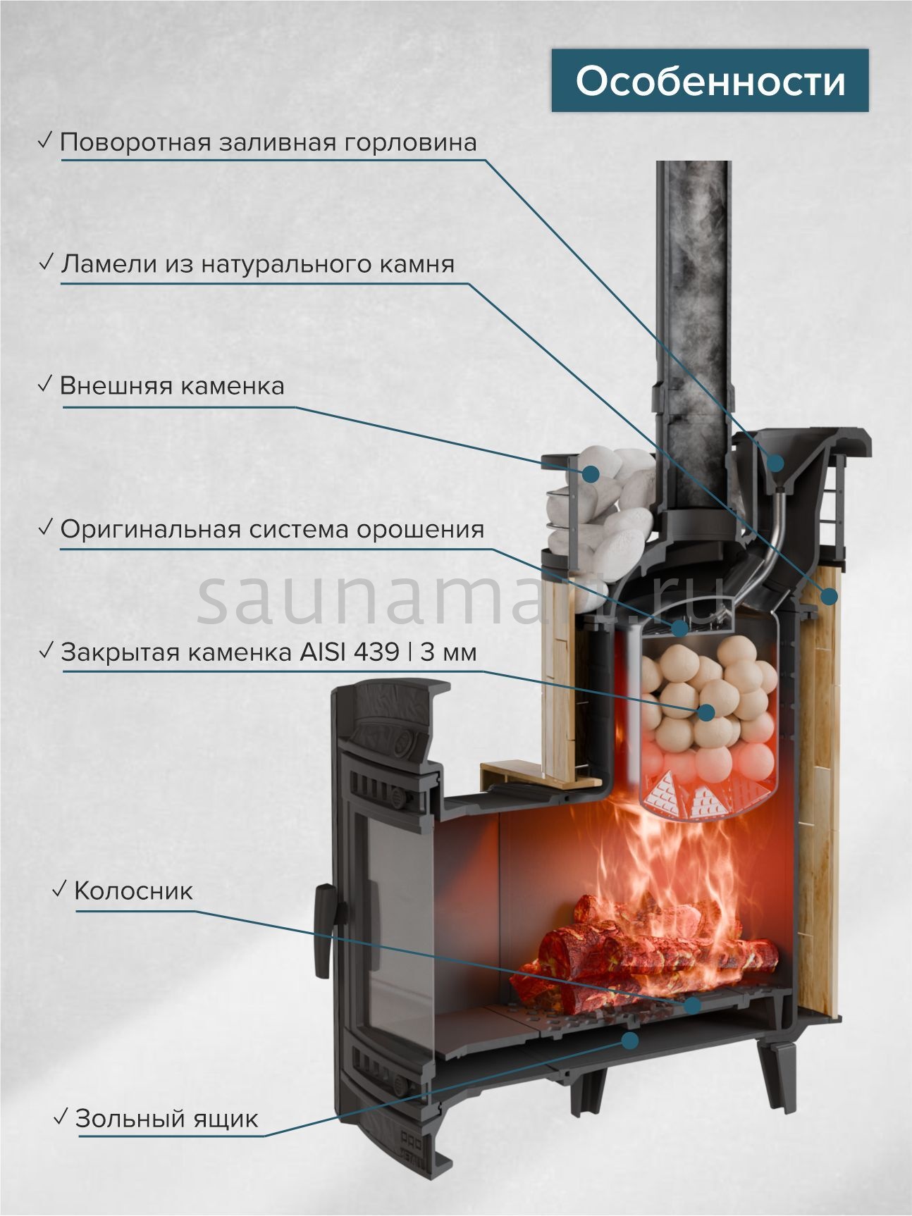Модель с увеличенной каменкой и повышенной производительностью. Ламели по периметру внешней каменки не только обладают хорошими теплонакопительными свойствами, но и придают печи оригинальный внешний вид