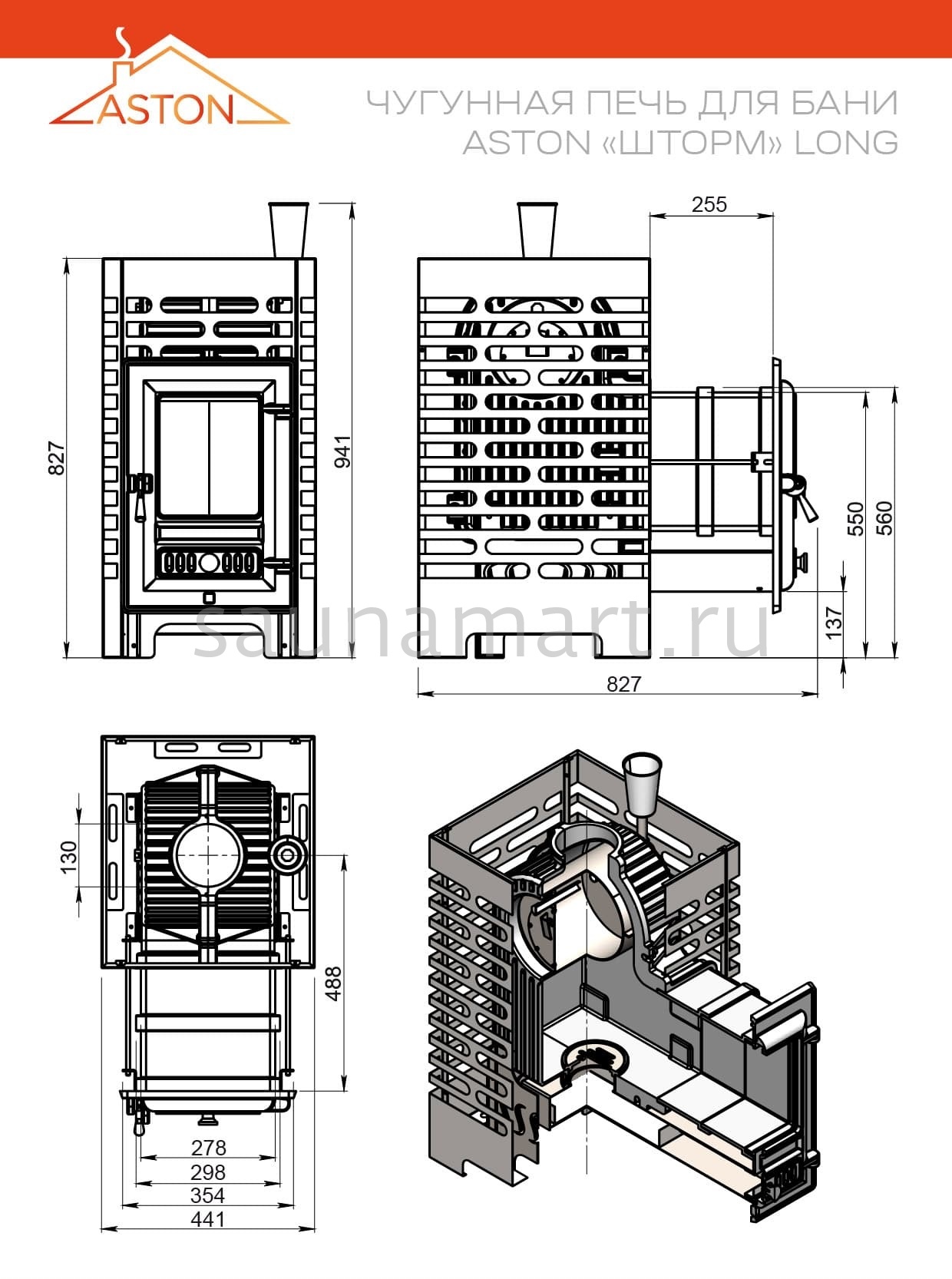Особенности модификаций: Чугунные печи ASTON и ASTON "Шторм Турбопар" представлены в нескольких модификациях, отличающихся длиной топочного тоннеля. Модели с обозначением "б/в" (без выноса) не имеют выноса и предназначены для обслуживания из парной. Стандартные модификации и версии Long позволяют топить печь из предбанника, при этом толщина стены может достигать 14 см для стандартных моделей и 28 см для модификации Long.