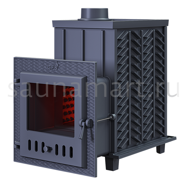 GFS-ЗК 25 (М) — это печь с усиленной каменкой большей массы, с единым углублением внутрь топки для дополнительной укладки чугунного заряда. Теплосъемные шипы, со стороны горения пламени, в разы увеличивают площадь соприкосновения огня с каменкой и ускоряют передачу тепла, а также способствуют лучшему дожигу, смешивая потоки пламени и воздуха, поступающего из воздушника. Эти усовершенствования значительно повышают мощность парообразования печи и выдают большее количество пара при непрерывной подаче воды. Каменка печей GFS-ЗК является незаливаемой.