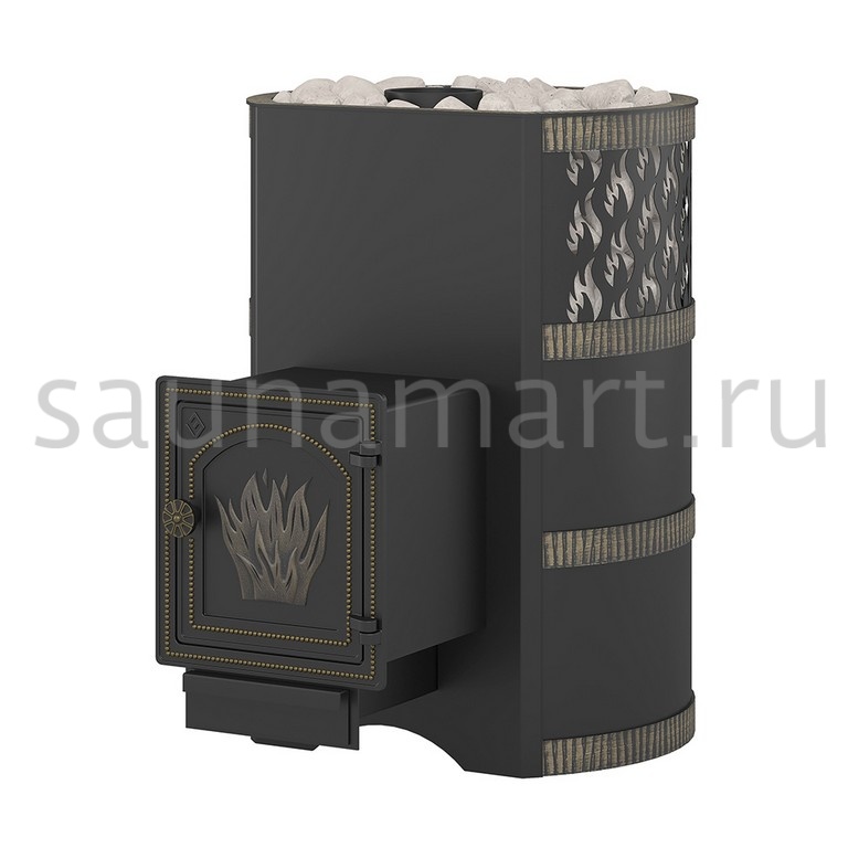 В печи обеспечен дожиг вторичных газов посредством широкого П-образного профиля на задней поверхности топки, который, доставляя воздух в зону активного горения, увеличивает КПД печи и дополнительно усиливает заднюю стенку печи. Кожух из стального листа и кованых стальных колец предназначен для обеспечения конвекции устройства открытой каменки и дополнительно защищает парящихся от жёсткого инфракрасного излучения. В верхней части кожуха для усиления движения воздуха сделаны прорезные отверстия в виде языков пламени.