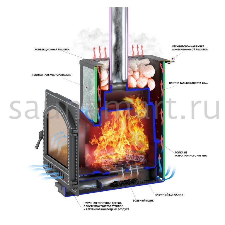 Преимущество печи в том, что топка печи состоит из 3-х чугунных элементов. На стыке между ними используется керамический шнур с рабочей температурой 1200 градусов. То есть топка печи абсолютно герметична! Для фиксации деталей между собой применяется болтовое соединение, что даёт 100% гарантию безопасности при эксплуатации. Конвекционно–вентилируемая облицовка, изготовленная из экологически чистой горной породы, обладает большой теплоёмкостью, что позволяет камню в короткие сроки нагреваться и максимально долго удерживать стабильную температуру в парильном помещении, а также гасить жёсткое инфракрасное излучение. Камень обладает исключительными лечебными свойствами: помогает при головных болях, при нестабильном артериальном давлении, при простудных заболеваниях, воспалительных процессах в почках и пищеварительной системе, снимает повышенную возбудимость и нервозность, сглаживает эмоциональные всплески. Облицовка из натурального камня при нагреве способна аккумулировать тепло, что гарантирует максимально равномерный прогрев и сохранение тепла.