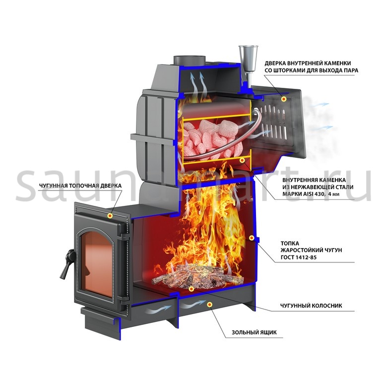 Печь отличается от линейки Ураган прежде всего наличием закрытой каменки, которая охвачена круговым потоком пламени. В ней камни прогреваются до температуры 400-500°С, что позволяет создать в парилке микроклимат, характерный для русской парной. Вода подается в самую горячую центральную часть закрытой каменки через воронку. При этом дверь закрытой каменки должна быть приоткрыта для поступления мелкодисперсного пара в парное отделение. Все элементы топки отлиты из чугуна и соединены между собой с помощью болтового соединения через термостойкий шнур и герметик, а закрытая каменка изготовлена из жаростойкой высоколегированной 4 мм нержавеющей стали.