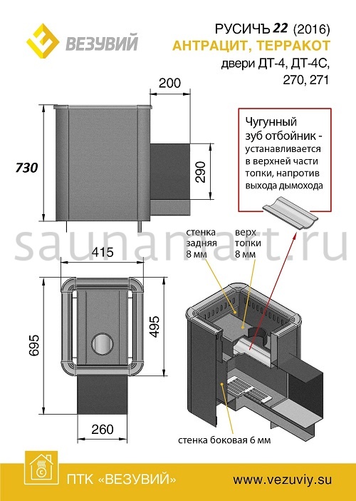 Конвекционная банная печь ВЕЗУВИЙ Русичъ Антрацит 22 (ДТ-4) изготовлена из особо прочной котловой стали марки 09Г2С толщиной 4-6 мм и может устанавливаться в парную объёмом от 12 до 24 кубических метров.