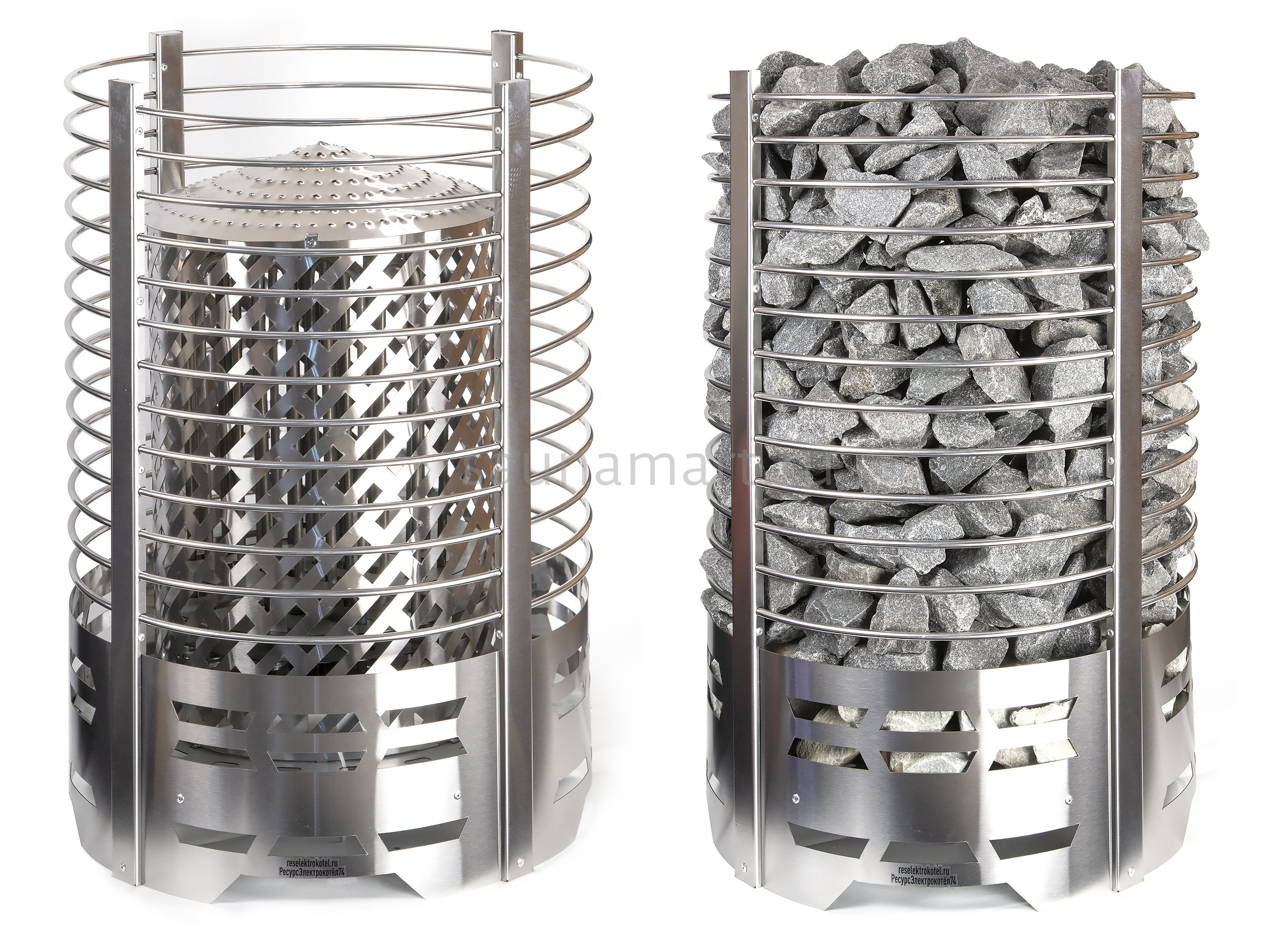 Материал изготовления: нержавеющая сталь (марка стали 304 и 430 комбинированно). КАМЕНЬ ЖАДЕИТ приобретается отдельно. К данной модели электрокаменки необходимо докупить выносной пульт управления, который служит для поддержания температуры, так как встроенного управления в электропечи нет.