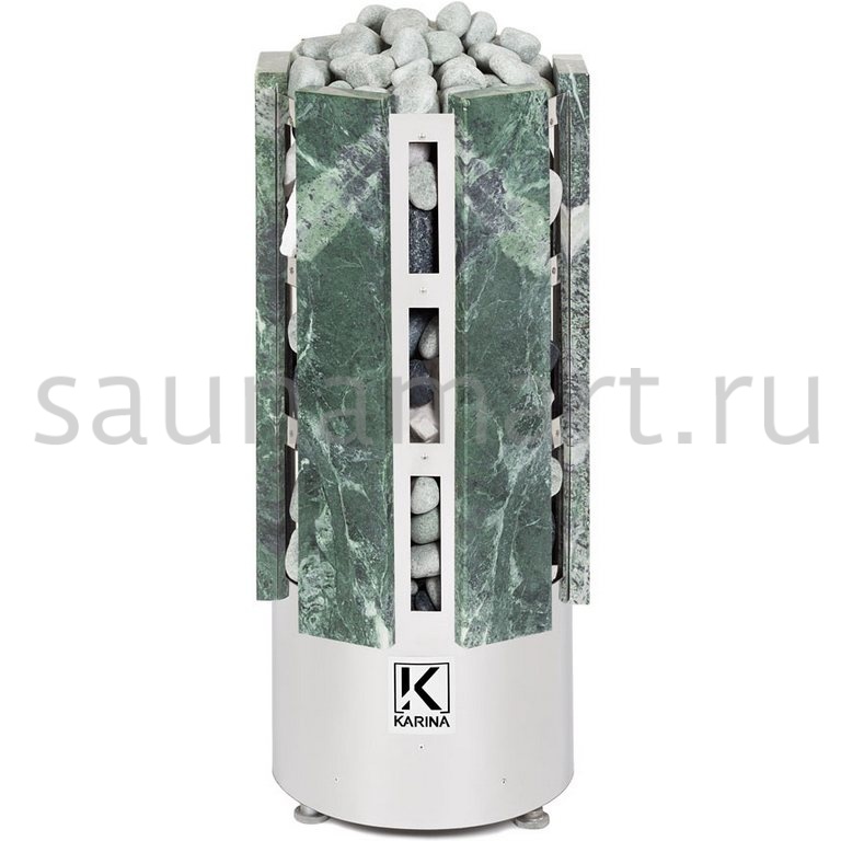 Электрокаменка Karina Forta 10 Змеевик предназначена для использования в парных объемом до 14 м?. Печь выполнена в напольном варианте и обладает цилиндрической формой, дополненной плитами из натурального камня Змеевика.