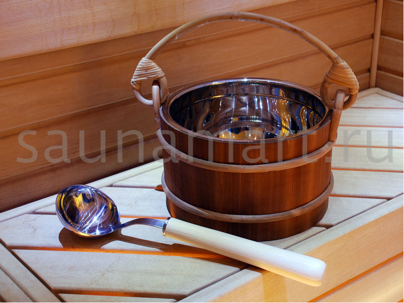 Ковш марки Sawo сделан из нержавейки и оснащён деревянной ручкой.