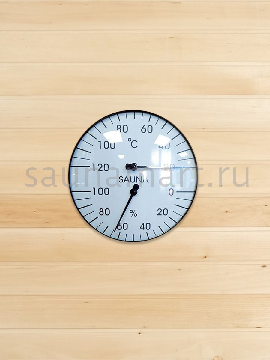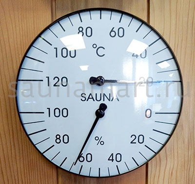 Термогигрометр имеет оригинальную круглую форму. В широкой рамке из древесины кедра находится циферблат, который сообщит о температуре воздуха. Данный прибор прекрасно подойдёт для использования в парной. Максимально допустимая для измерения температура составляет 120 градусов Цельсия. Этого максимума достаточно для комфортных банных процедур. Нагнетание в парном помещении большей температуры нежелательно, так как может быть опасным для здоровья. Благодаря универсальному дизайну термометр станет прекрасным дополнением любого интерьера.