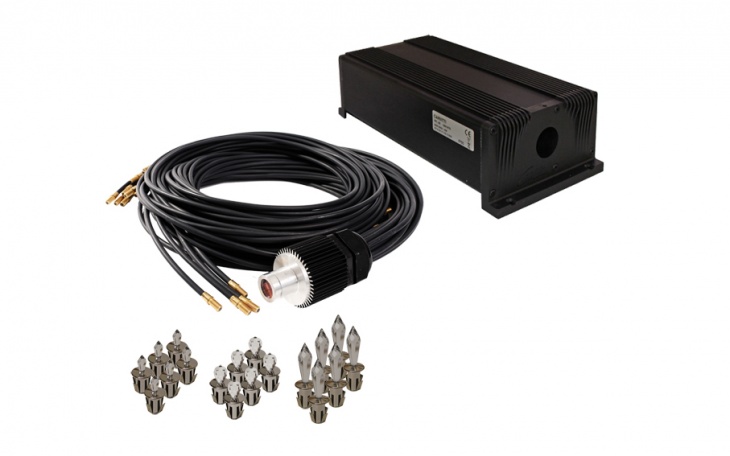 Полный, готовый к установке, комплект включает проектор, волоконный жгут и присоединяемые к концам волокон хрустальные насадки, 18 шт. Металлическая часть кристаллов подзолоченная. Диаметр волокна 0,75 и 3 мм (для кристаллов). Количество и длина волокон: