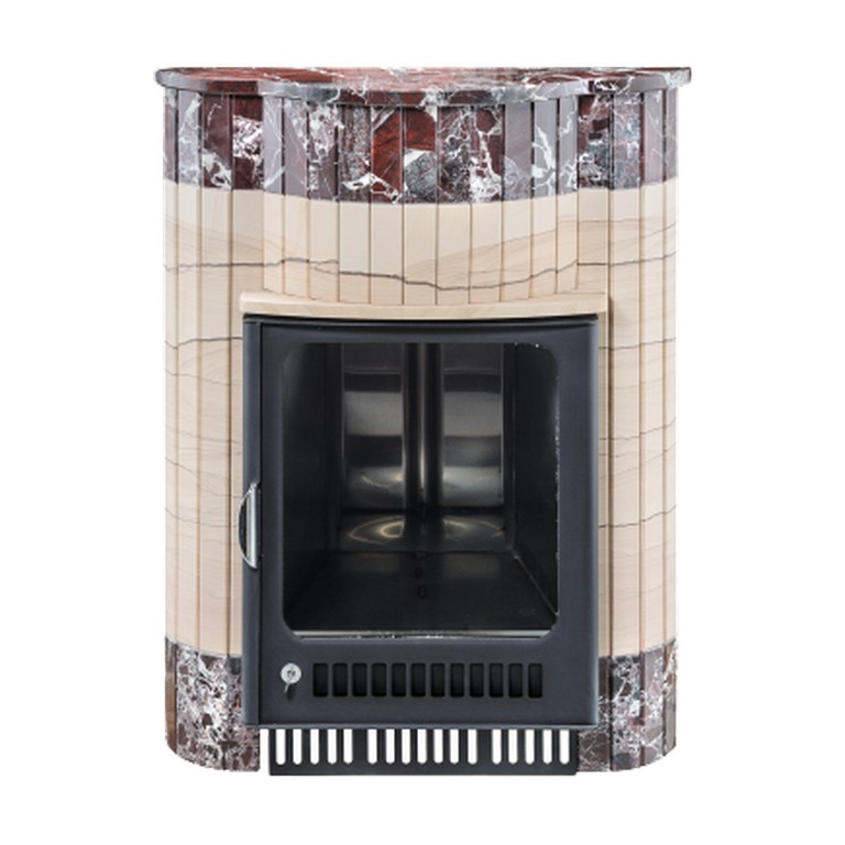 Для печи «Оптима» серии ПФ производитель V?hringer выпускает порталы из натурального мрамора, змеевика и жадеита. Облицовочные материалы поступают на завод в слэбах, заготовки разрезают на пластины, которые затем навешивают на печь.