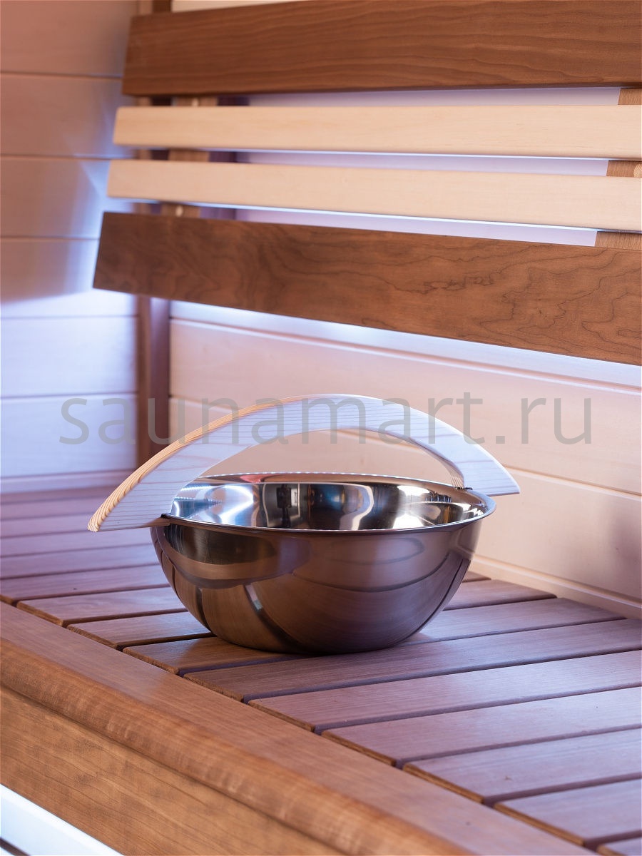 Чаша из нержавеющей стали – это незаменимый при проведении банных процедур аксессуар. В него набирают воду с тем, чтобы потом зачерпывать ее ковшом и подливать на камни, получая большое количество пара. Емкость изготовлена из нержавеющей стали, что позволяет ей не бояться контактов с водой и высокими температурами. Материал, из которого изготовлена емкость, не подвержен коррозии при контакте с влагой. Чаша оборудована деревянной ручкой, которая позволяет комфортно и безопасно ее перемещать. Для безопасности и сохранности камней рекомендуется подогревать воду, используемую для получения пара. Вместимость чаши составляет шесть литров.